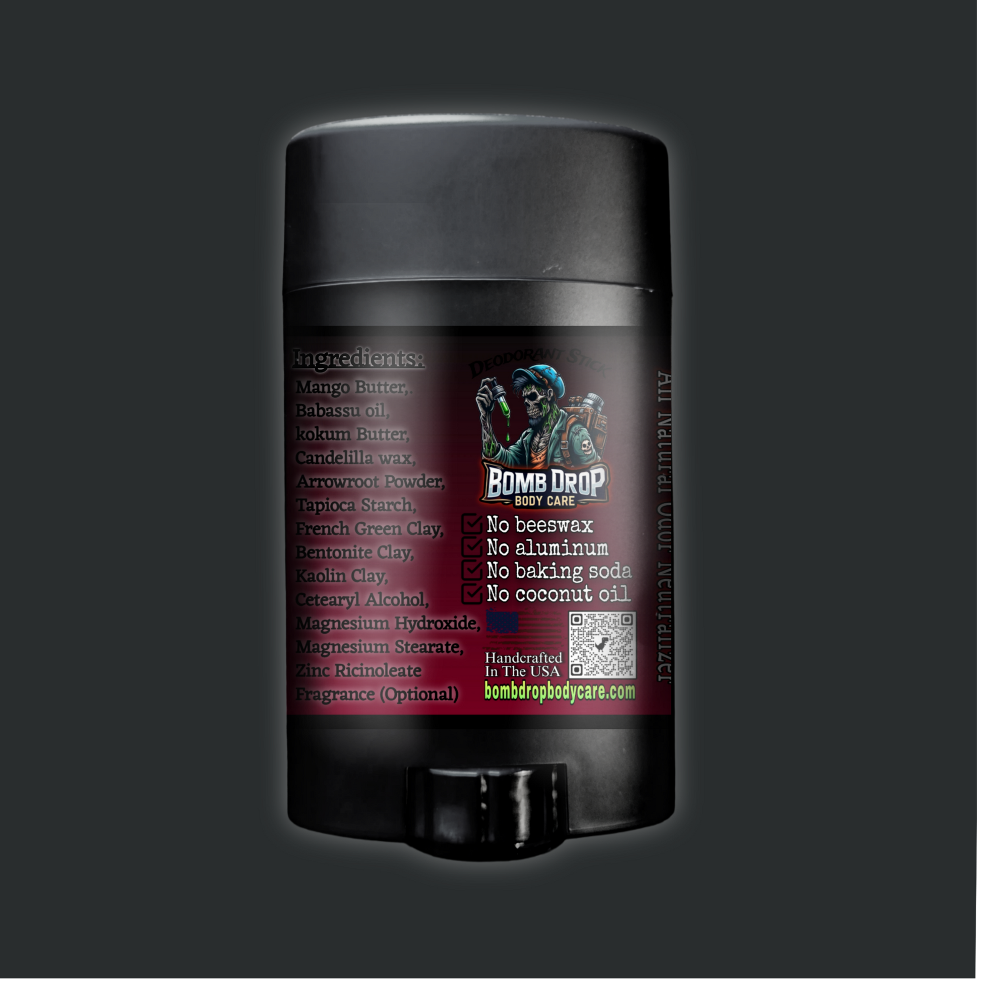 Mango Butter, Babassu oil, kokum Butter, Candelilla wax, Arrowroot Powder. Tapioca Starch, French Green Clay, Bentonite Clay, Kaolin Clay, Cetearyl Alcohol, Magnesium Hydroxide, Magnesium Stearate, Zinc Ricinoleate & Fragrance